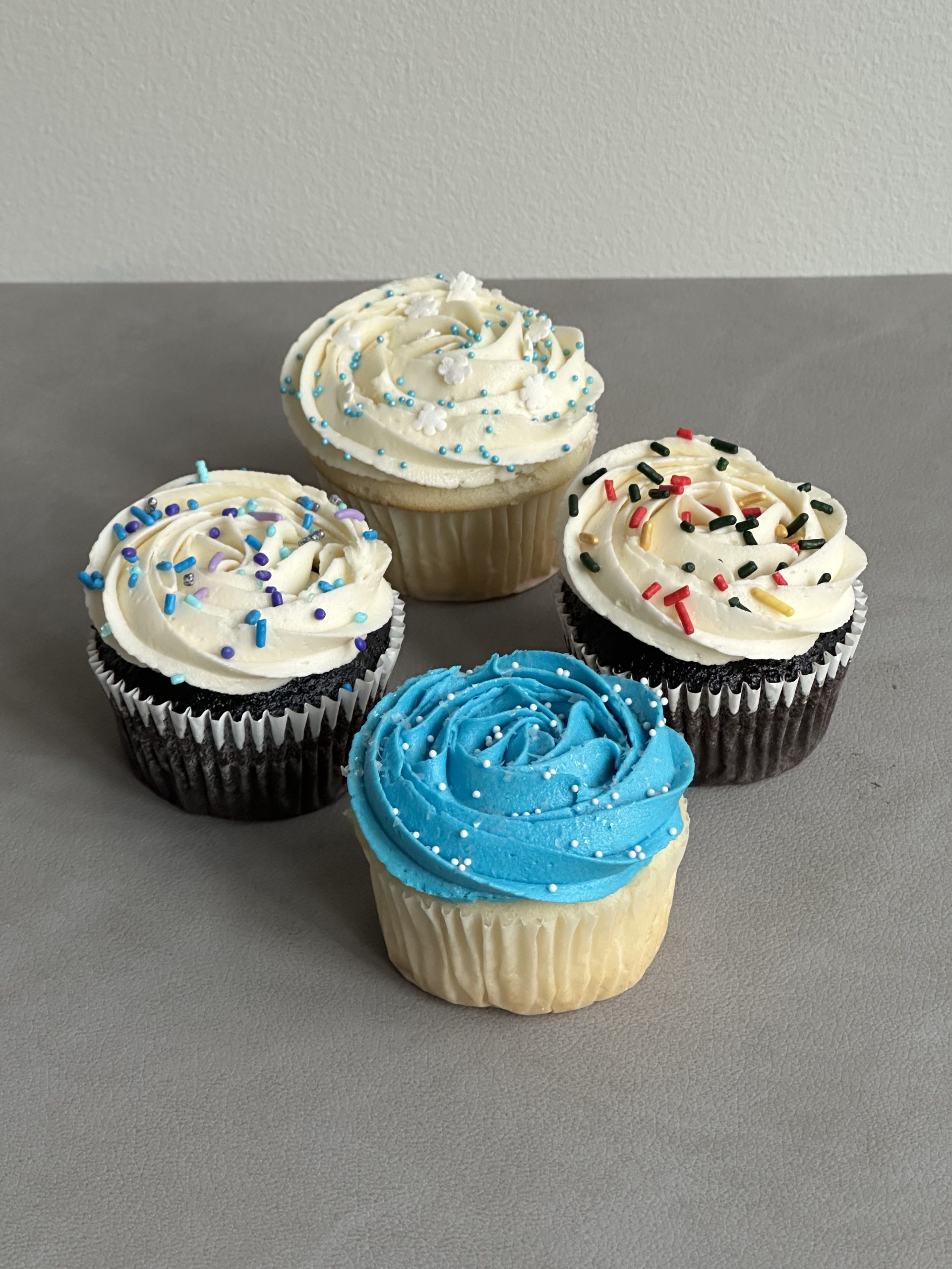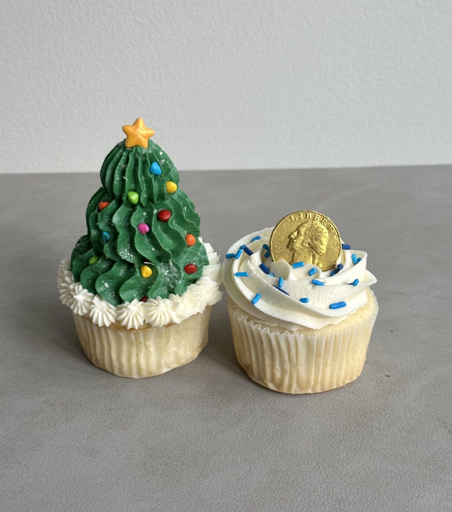 Holiday-themed cupcakes topped with vanilla American buttercream!